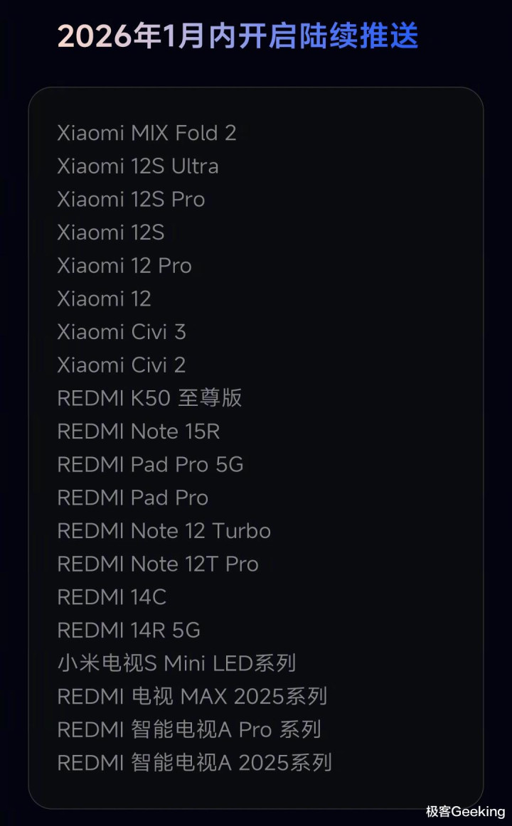 第六批将在明年 1 月开启陆续推送,包含小米手机、红米手机和电视设备: