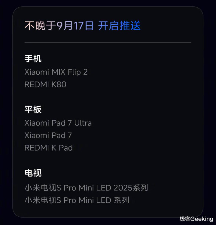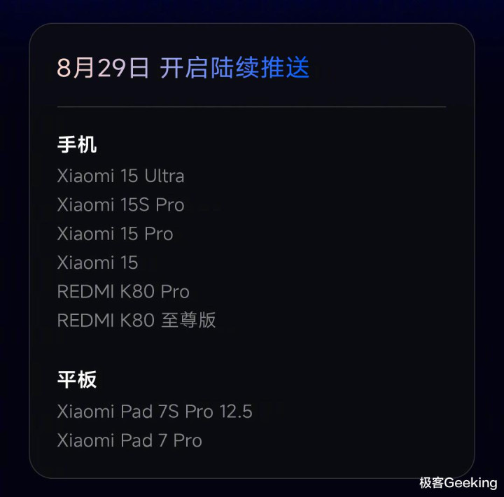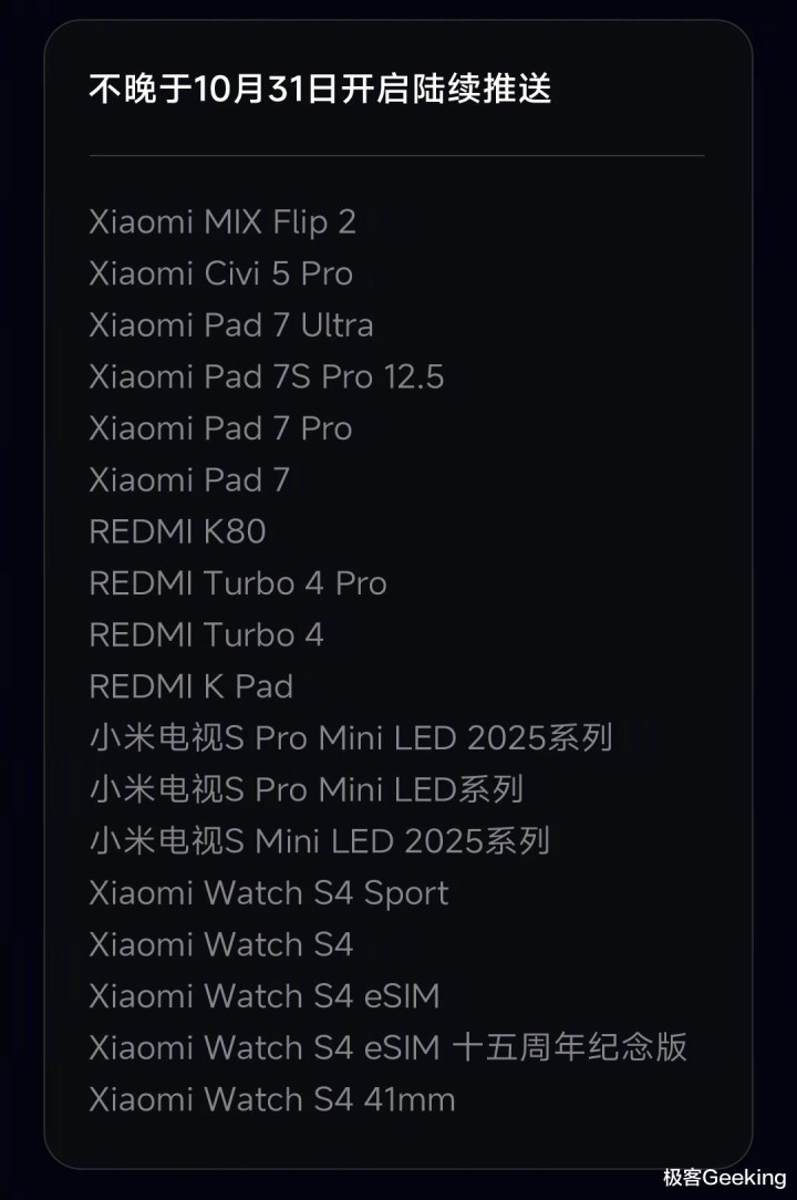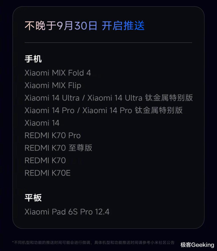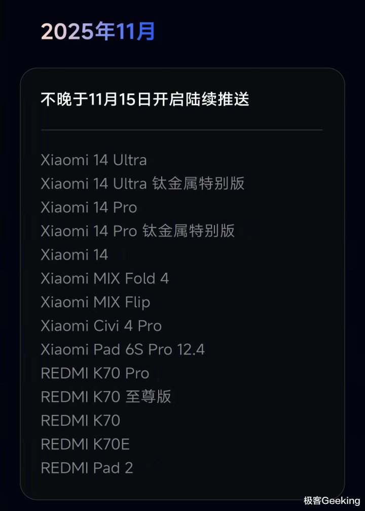 具体来看,第一批将在不晚于 10 月 15 日开启升级,共有 6 款机型,包括小米15 和红米K80 系列,可以发现与首批 Beta 版的适配机型类似: