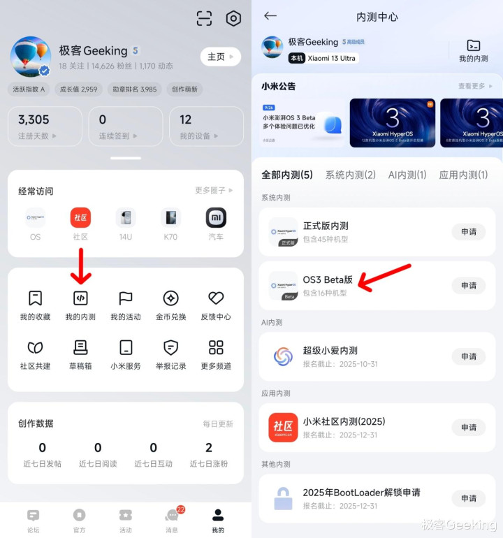 目前,想要尝鲜升级 Beta 测试版升级需要参与报名招募,方法也很简单。首先打开小米社区 App,接着点击「我的」-「我的内测」进入「内测中心」,在「全部内测」中就会看到「OS3 Beta 版」。