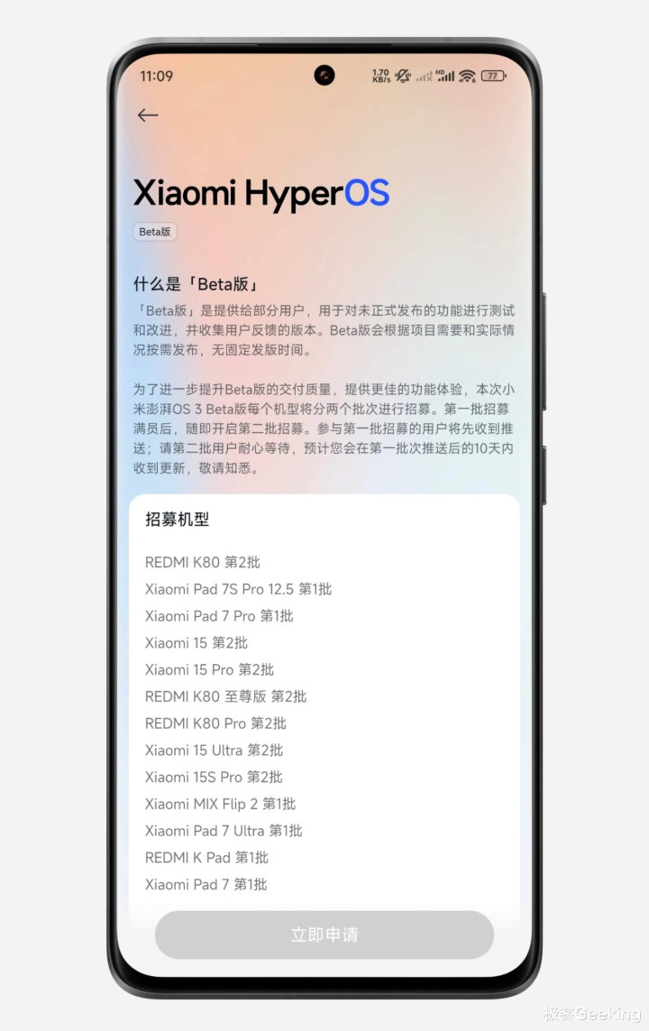 第三批小米澎湃OS 3 的 Beta 版官方称不晚于 9 月 30 日推送,支持以下这些共 12 款机型设备:
