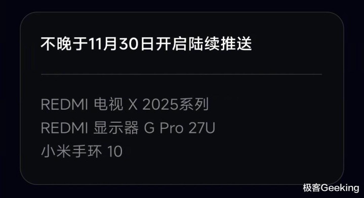 第四批将在 11 月底开启陆续推送,共有 3 款机型,包括电视和智能手环设备: